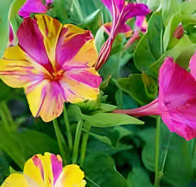 Mirabilis jalapa Broken Colours is a colourful quick growing plant from Peru with small trumpet-shaped, sweetly scented flowers. This one has bi-coloured and mottled flowers in yellow, red pink and white. Trumpet-shaped blooms are true to their name of Four O'Clocks and open in late afternoon to release a soft, pleasing fragrance